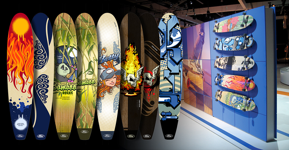 Interactive Longboard Skate Deck Designer. Artwork for a Drag and drop interactive whereby guests create their own deck designs on touch screen displays. Best design was voted at the end of the show and given as a prize.