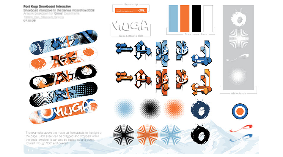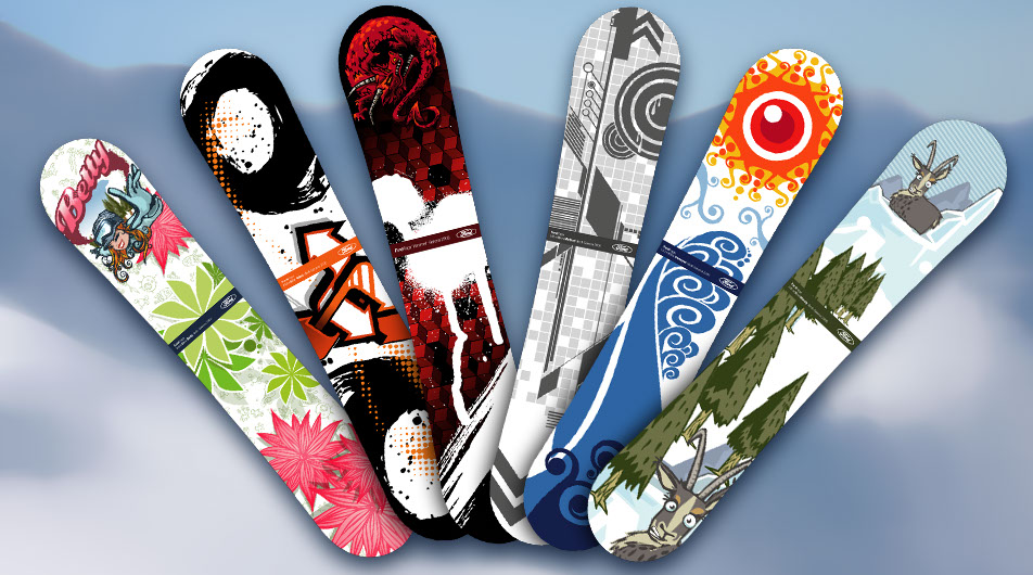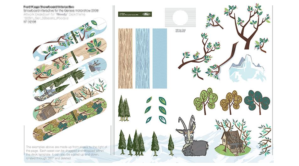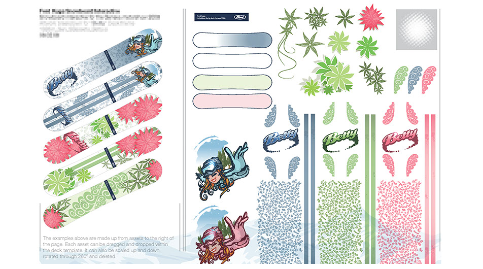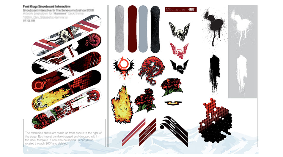 Interactive Snowboard Designer. Artwork for a Drag and drop interactive whereby guests create their own deck designs on touch screen displays. Best design was voted at the end of the show and given as a prize.