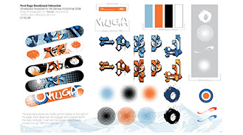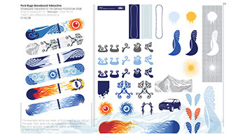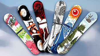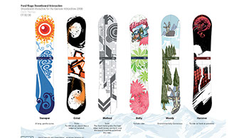 Interactive Snowboard Designer. Artwork for a Drag and drop interactive whereby guests create their own deck designs on touch screen displays. Best design was voted at the end of the show and given as a prize.